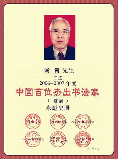 常青先生的书法、篆刻作品曾在利比亚、日本、韩国、俄罗斯、哈萨克斯坦、法国、土耳其、蒙古国、香港、奥门等地巡回展出。在国际、国家、省、市书画大赛中获金奖多次,亦在全国、省市报刊上屡有发表。被授予"国际金奖艺术家″、"世界书画艺术名人"、"中国百杰书法家″、"中国书画500强″、"渭南文化名人″等荣誉称号。著有《常青印谱》、《常青篆刻百猴印》、《常青篆刻百鸡印》、《常青12生肖印选》、《渭南市名胜景观印选》。《迎奥运20.08米篆刻长卷被北京奧组委收藏。15幅猴肖形印和书法作品、个人艺术简历被《国家名片》中国邮册收录,被制成个性邮票、明信片、中邮一卡通等邮品在全国公开发行。